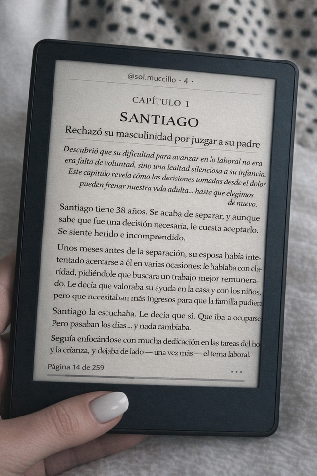 "Soy de Chile y encontré a Sol por Instagram. Compré Historias de Liberación porque el precio era ridículo (menos que un almuerzo) y porque los casos que describía eran demasiado específicos para ser mentira. Cuando leí el caso de Santiago me quebré. Yo juzgué a mi padre toda mi vida por 'débil' y resulta que rechacé mi propia fuerza masculina en el proceso. Llevo 15 años sin poder avanzar laboralmente, siempre frenándome justo antes de dar el salto. El ebook me mostró el patrón, el workbook me ayudó a mapearlo, y ahora estoy en lista de espera para una sesión con Sol. Esto debería enseñarse en las escuelas."